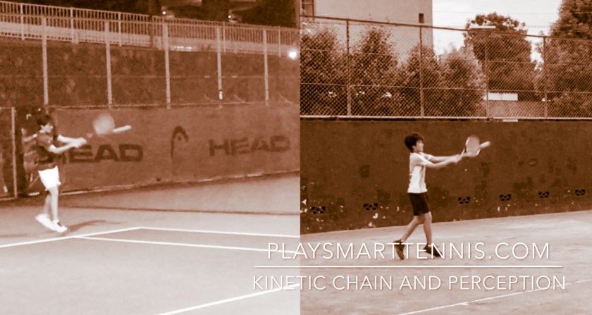 When the player is having defensive (and negative) thoughts, the center of mass is moving backwards. The negative thoughts are reflected through hesitation and backing off the ball. The weight is transferred backwards onto the whole foot (heels) automatically taking away the pressure of the toes pushing against the ground. Not only that in this way the weight is moving backwards before the stroke but during the stroke the player tends to straighten up and move the body upwards. Kinetic chain is efficient if the player transfers the energy from the ground (toes) to the hand wrist and grip pressure points, which should always be at the zone of the contact, IN FRONT OF THE BODY. If the player moves upwards, like in this case, the energy is transferred upwards (linear transfer without the angular transfer forwards) so the player hits the ball only using arm power.