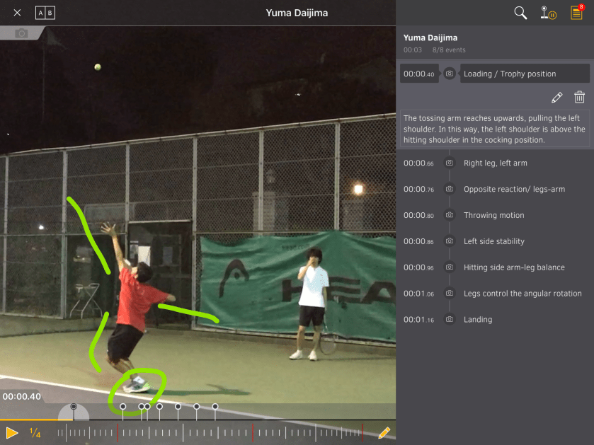 Front leg ankle. 足首が足底屈伸の状態になっているので、前脚の安定性が増しています。この屈曲により、フォロースルー動作の最後にコートの内側に強く働きかけるための前脚の引き力が増している。